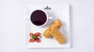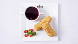 Barszcz czerwony, krokiety z białym serem, ziemniakami i cebulą