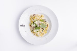 Carbonara z boczkiem, szpinakiem i czerwoną cebulą