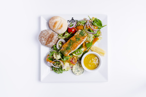Sałaty z łososiem grillowanym, sos miodowo-musztardowy